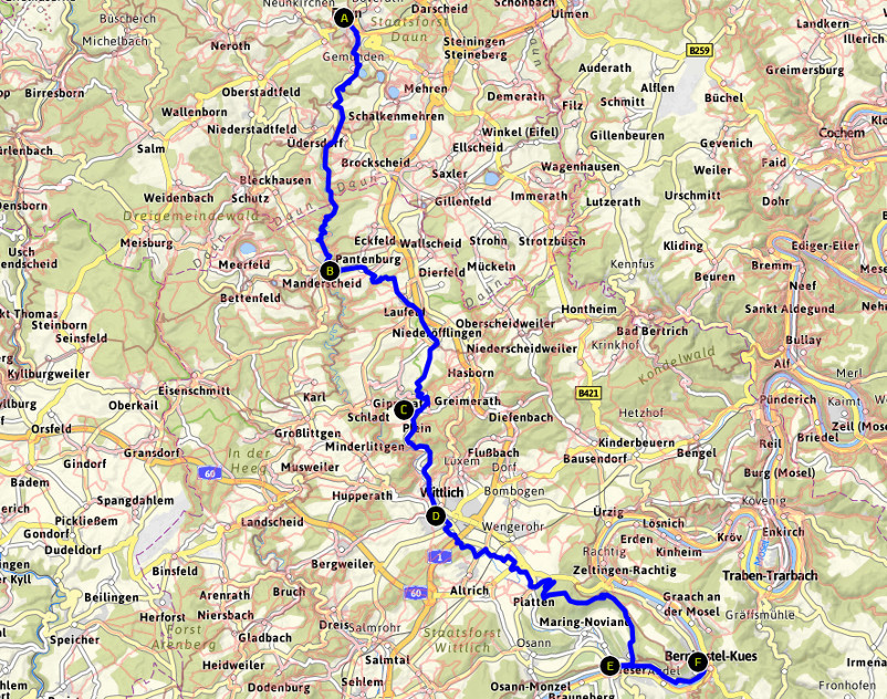 in Wittlicher Nähe mit entschieden mehr Gegenverkehr durch herauffahrende Radfreunde zu rechnen. In Wittlich ist die Beschilderung etwas lückenhaft, deshalb immer in Richtung Busbahnhof halten. Von dort geht es dann fast eben durch das Tal der Lieser bis zur Mosel weiter, wo man die Bundesstraße überquert und dann links ab zurück nach Bernkastel fährt. Wenn ihr diese Tour machen wollt, rechnet mit Anfahrt von Koblenz und späterer Heimfahrt mit etwa 9 Stunden, die ihr unterwegs seid.