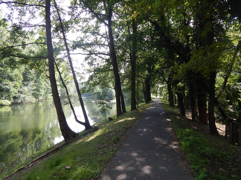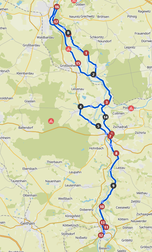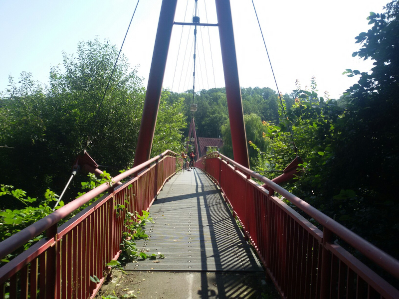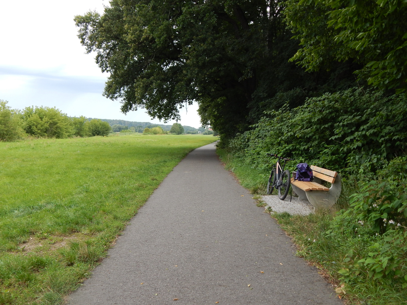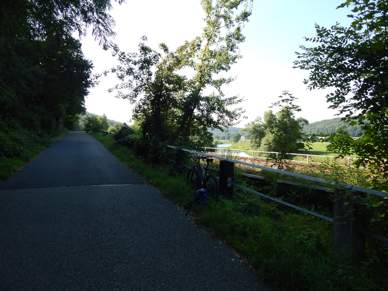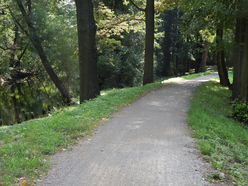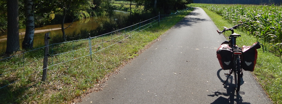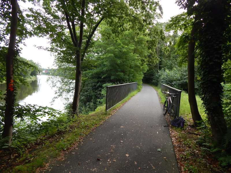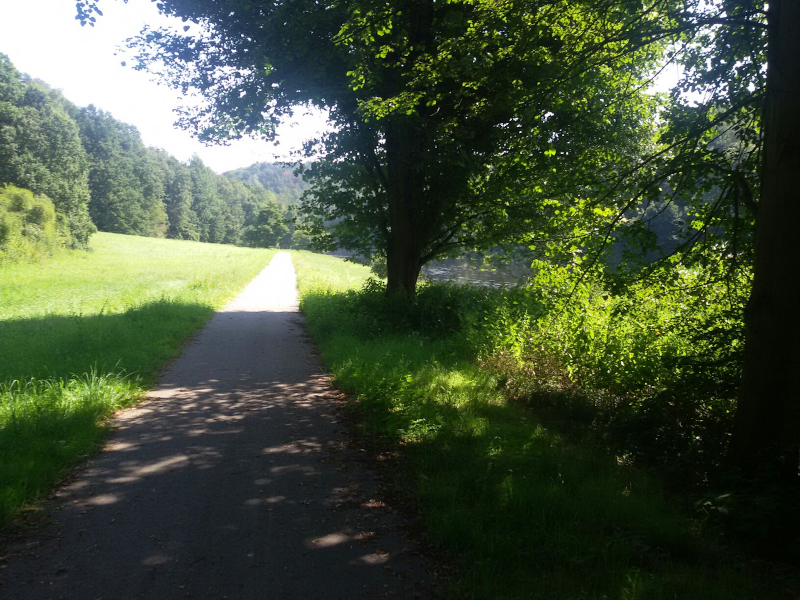 Radweg dorthin sah wie auf dem Bild unten aus. Langsam wuchs der Ärger. Also zurück bis hinter die Pension, über die Brücke am Wasserfall in den Elbauen, wo die nächsten zwei Bilder mit dem gewollten