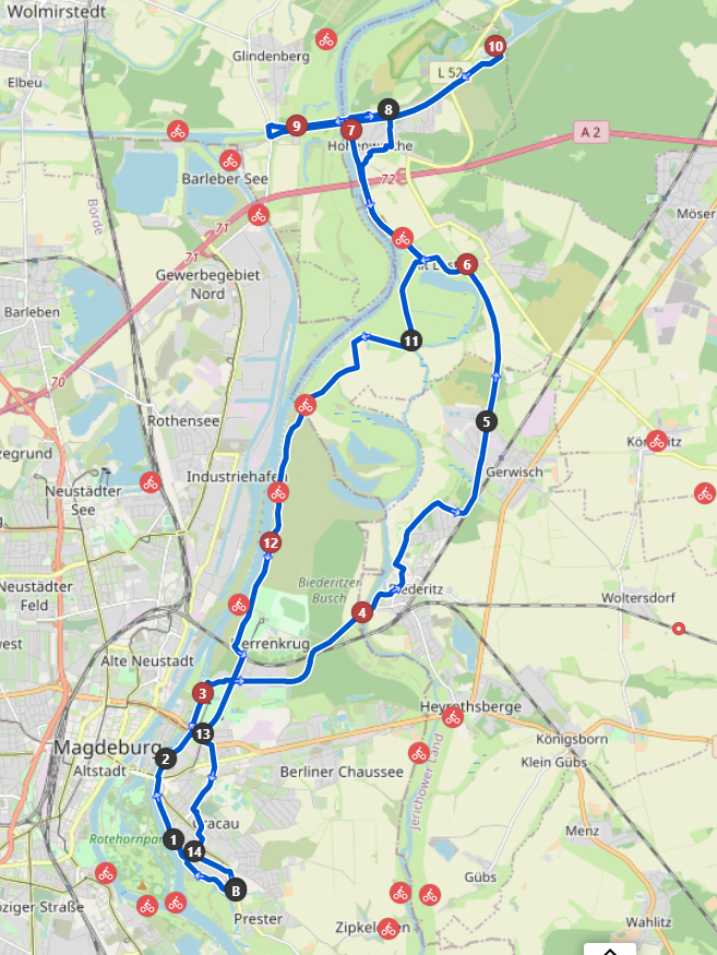 15 Kilometer auf dem Tacho und noch keinen Meter näher an Schönebeck als bei der Abfahrt. Bis zur Magdeburger Südvorstadt verläuft der Radweg auch schön am Wasser lang, danach muß man jedoch in den