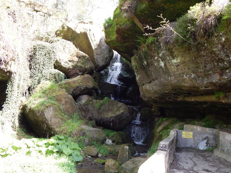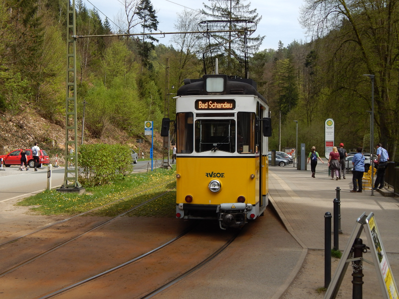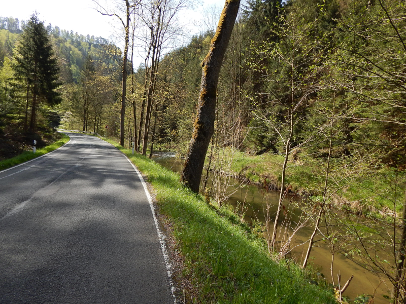 Hinter Hinterhermsdorf kam dann die letzte Abfahrt. Man befindet sich jetzt auf der Kirnitzschtalstraße. Die ersten Kilometer geht es leicht abfallend (ca 2-3 % Gefälle) immer schön durch´s Tal. Zunächst ist die Kirnitzsch noch sehr schmal, wenn man dann zu den drei hintereinander liegenden Mühlen Buschmühle, Neumannsmühle und Felsenmühle kommt, wird sie jedoch breiter. Auch ist hier unter der Woche und außerhalb der Ferien noch nicht allzu viel los. Der Autoverkehr hielt sich einigermaßen in Grenzen, man konnte sehr gut auf der Straße fahren. Etwas voller wurde es dann am Lichtenhainer Wasserfall. Hier gibt es nicht nur den Wasserfall zu besichtigen, hier ist auch die Endstation der Kirnitzschtalbahn. Sie ist die einzigste Straßenbahn weltweit, die durch einen Nationalpark fährt. Ab hier bis Bad Schandau (ca 8 Kilometer) laufen auf der Straße auch die Schienen der Bahn.
