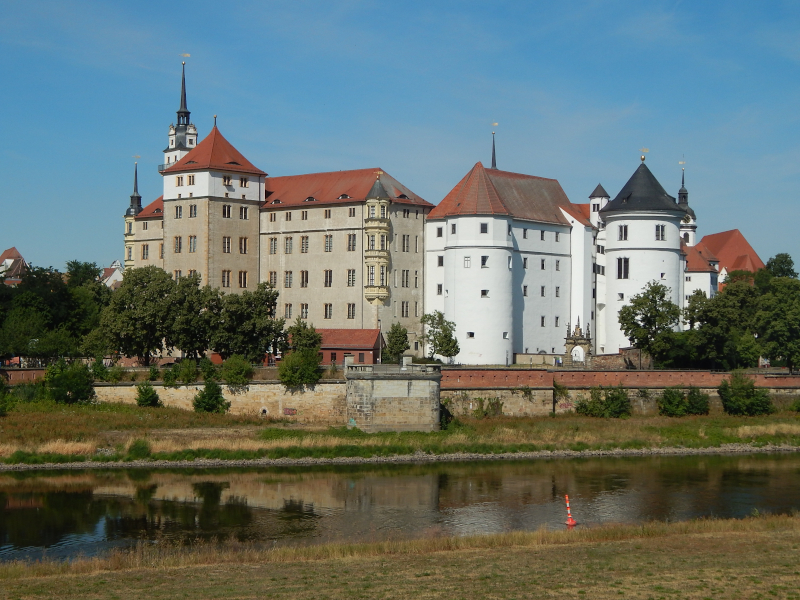 Heute war das Ziel meiner Etappe Torgau an der Elbe. Auf der Straße ging es zunächst nach Annaburg. Am Ortsende trifft man auf den Radweg, der einen in den kleinen Vorort Naundorf/Kolonie bringt. Nach drei Kilometern Radweg ist schon wieder das Ende erreicht, von jetzt an ging es nur noch auf Straßen weiter. Über Naundorf, Großtreben und Rosenfeld kommt man nach Zwethau. Ab hier geht es dann auf dem Radweg neben der Bundesstraße 87 weiter nach Torgau. Von Jessen bis Torgau sind es 35 Kilometer, davon fährt man nur sechs Kilometer auf Radwegen. Von der Torgauer Brücke hat man einen freien Blick auf Schloß Hartenfels, was ich für ein Foto nutzte. Nach einer Stärkung in Torgau (Restaurant, Bäckerei, Eisdiele und Lebensmitteldiscounter, alles vorhanden) ging es nun auf dem linksseitigen Elberadweg über Repitz, Döbern und Elsnig nach Dommitzsch zur Fähre. Fast zwanzig Kilometer Wegstrecke, und bei den heutigen Temperaturen (35 C.) fast die gesamte Strecke ohne Schatten. Von Prettin aus ging es dann in den kleinen Ort Axien, dort war ein Treffen von Freunden amerikanischer Muscle-Cars. Autos mit 8 Zylindern, 6 - 7 Litern Hubraum und zwischen 300 und 500 PS.