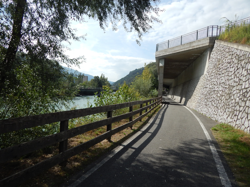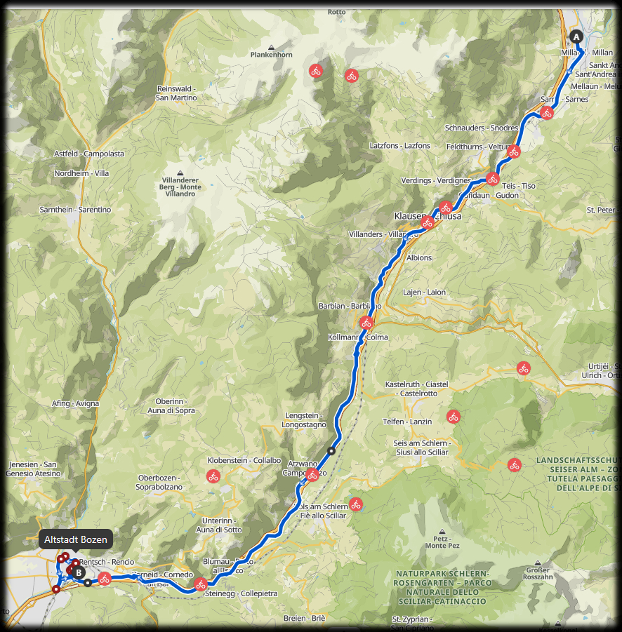 Am Ende der Gasse ein kleiner runder Marktplatz mit Geschäften, Cafe und einem Hotel rund um den Marktbrunnen. Das nächste Fotomotiv war die Trostburg, die oberhalb von Kollmann über der Eisack liegt. Sie thront nicht zu übersehen auf der anderen Seite der Eisack. Anschließend brachte einen die erste Brücke auf die andere Flussseite und nach knapp einem Kilometer ging es wieder auf die ursprüngliche Seite zurück. Man fährt nun bis Bozen durch insgesamt sechs Fahrradtunnel, die aber alle ziemlich breit sind. Am Ende der Tunnel stehen Bänke zum Pause machen. Man sollte sich mal dort hinsetzen. Man hört nichts außer dem Rauschen der Eisack. Ab und zu, wenn das Tal besonders schmal ist, fährt man direkt an der Straße entlang. Es wird lauter und auch der Radweg selbst ist stellenweise sehr schmal. Über Blumenau kam ich nach etwas über 40 gefahrenen Kilometern in Bozen an.