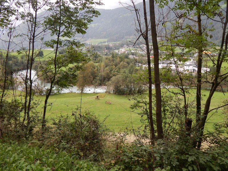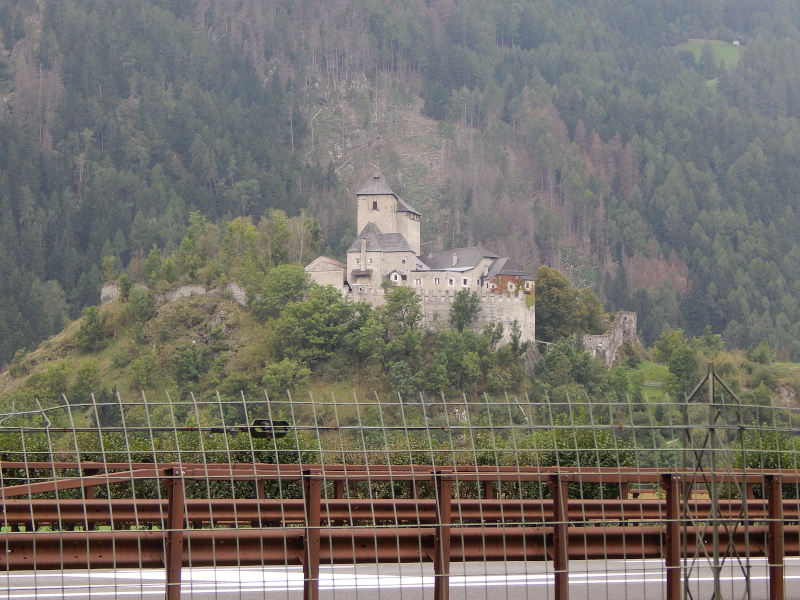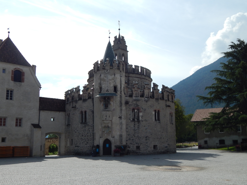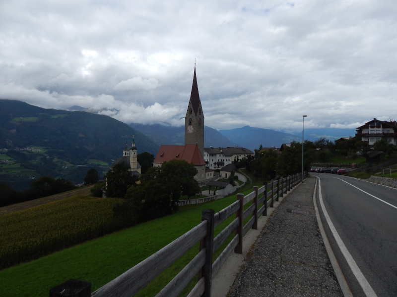 Der Regen ist weg, also ab auf´s Rad. Zum Brixener Bahnhof, wo mich der erste Zug in einer zehnminütigen Fahrt nach Franzensfeste brachte. Dort Umstieg in die Pustertalbahn. Nach weiteren vierzig Minuten hatte ich meinen Endstationsbahnhof in Bruneck erreicht. Es ging zu Fuß durch die Innenstadt zum Anstieg zum Brunecker Schloß. Auf einem sehr steilen (21%) und mit zahlreichen Schlaglöchern übersätem Weg ging es hoch. Von hier oben hat man einen tollen Blick auf die unten in der Stadt stehende Pfarrkirche mit ihren Doppeltürmen. Im Schloß selbst ist das Bergsteigermuseum von Reinhold Messner untergebracht. Danach zurück in die Innenstadt und zum Fluß Rienz, wo der Radweg Richtung Toblach oder zurück nach Franzensfeste verläuft. Ich hielt mich in Richtung Franzensfeste und im ca. drei Kilometer entfernten St.Lorenzen war in einem Cafe erstmal Pause.