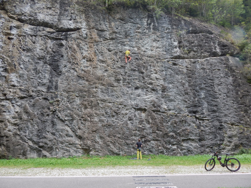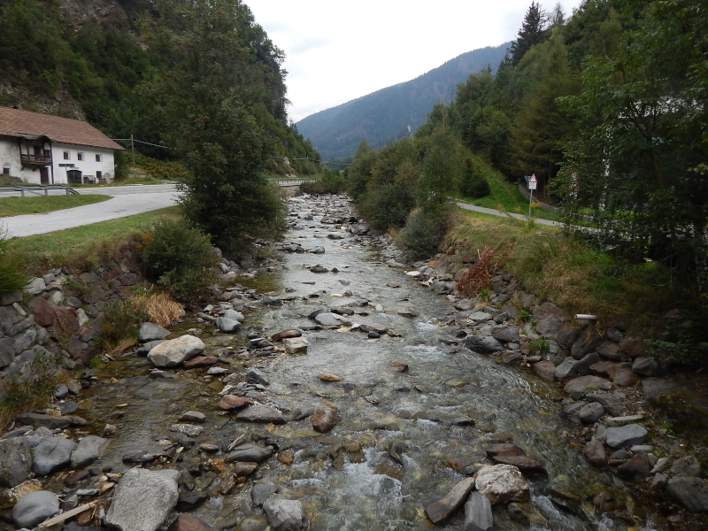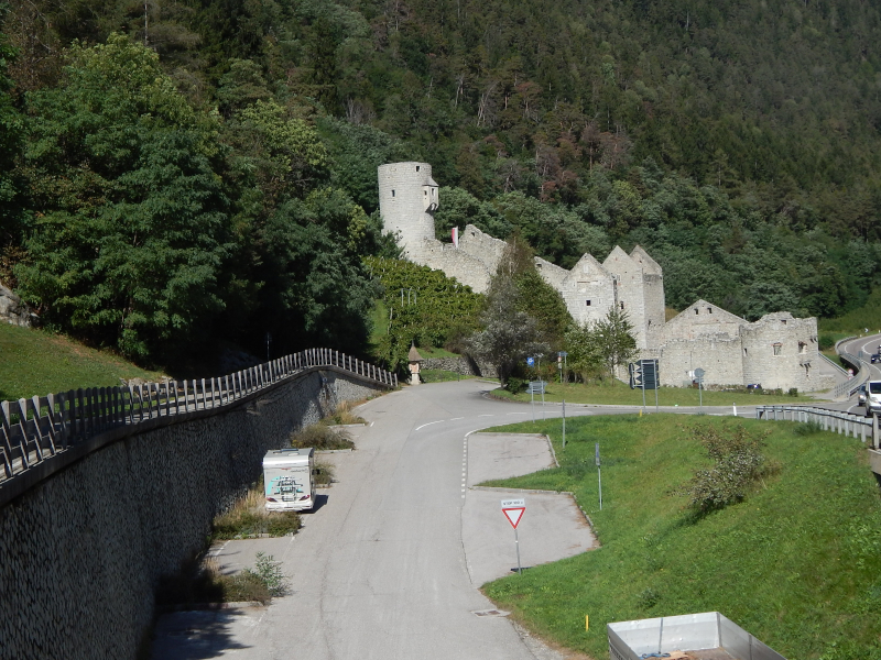 Auf meine zweite Tour freute ich mich besonders. Morgens ging es in einer fünfundvierzigminütigen Zugfahrt an den Brenner. Kurz hinter der Bahnstation sieht man rechts des Radweges den kleinen Wasserfall, der ein erstes Fotomotiv wert war. Kurz bevor man den zweiten Tunnel durchfährt steht eine etwa zwanzig Meter hohe Felswand, wo ich zwei Kletterern bei ihrem Hobby zusehen konnte. Hinter dem Tunnel kommt man am alten Bahnhof Schellenberg vorbei, der heute dem Verfall preisgegeben ist. Hinter Schellenberg bis in die kleine Ortschaft Gossensaß geht es mit teilweise 15% Gefälle abwärts. Zwei kleine Serpentinen auf dem Radweg bestätigen das. Über Oberried kommt man dann nach Sterzing. Laut Internet ist Sterzing die älteste Stadt Südtirols. Der Radweg verläuft durch die Fußgängerzone. Hinter Sterzing kann man rechts des Radweges die beiden Burgen Sprechenstein und Reifenstein sehen. Bis jetzt ging es eigentlich immer abwärts, aber hinter Sterzing wird der Radweg von der Eisack selbst weggeführt, und man fährt nun am Fuß der Berge weiter. Bis Franzensfeste liegen nun ein paar Gegenanstiege auf dem Weg, die auch mal bis zu 17% Steigung aufweisen können.