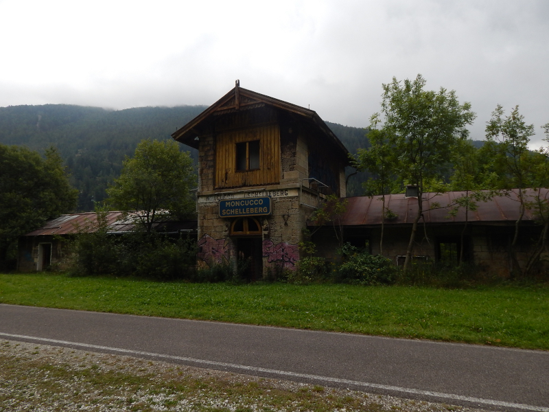 Zunächst ging es auf dem Eisackradweg über Klausen und Kollmann zu der unten auf dem Bild gezeigten Törggelerbrücke, wo auch diese inzwischen verschlossene Hütte steht. Vielleicht ein alter Bahnhof oder nicht mehr genutzte Bushaltestelle. Auf jeden Fall steht der Name Kastelruth noch dran. Vor vier Tagen fuhr ich hier geradeaus weiter nach Bozen, heute ging es über die Brücke in Richtung Kastelruth. Und gleich nach Überfahrt der Brücke wurde es richtig steil. Die drei nächsten Bilder versuchen die Steilheit des Geländes einzufangen. Am Standort des letzten Bildes bei der kleinen Gemeinde Tisens gab ich jedoch auf. Es ging mit angezogenen Bremsen zurück zur Törggelebrücke.