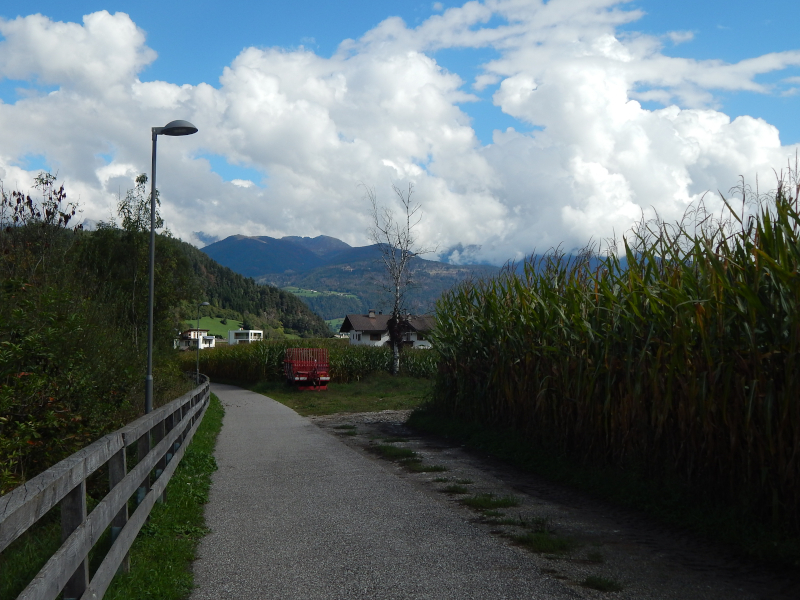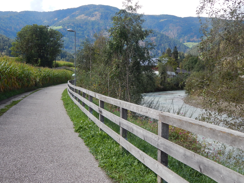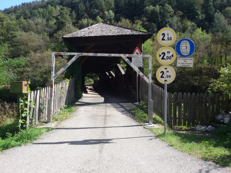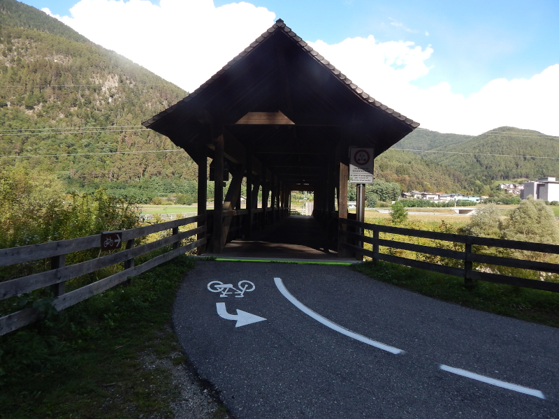 Die nächsten drei Bilder zeigen den Radweg direkt neben der Rienz zwischen St.Lorenzen und Montal. Vor Montal wird man zunächst über eine Brücke auf die andere Flussseite geführt und anschließend muß man die Straße überqueren. Hier muß man nicht dem Radweg neben der Straße links ab folgen sondern geradeaus weiter. Er geht ca. 15% bergauf, anschließend eine kurze Abfahrt. In der Ferne ist die Michelsburg zu sehen. Danach ist man direkt an der Bahnlinie der Pustertalbahn und es geht weiter über kleine Ortschaften wie Kriens, Ehrenburg, St.Siegmund, Nieder- und Obervintl. Wenn man die unten abgebildete Holzbrücke erreicht, ist man schon fast in Mühlbach. Hier wird man dann um den Ort herumgeführt und es geht nochmals sehr steil aufwärts. Nach einer viel zu kurzen Abfahrt kann man sich nun für den direkten Radweg (links abbiegend) nach Brixen entscheiden (ca. 7 Kilometer), oder man fährt über Franzensfeste zurück nach Brixen. Dieser Weg ist dann etwa doppelt so lang und man kommt an der Festung an. Weiter nach Brixen geht es dann auf dem Radweg an der Eisack entlang, den ich auf meiner Tour vom Brenner schon gefahren bin.