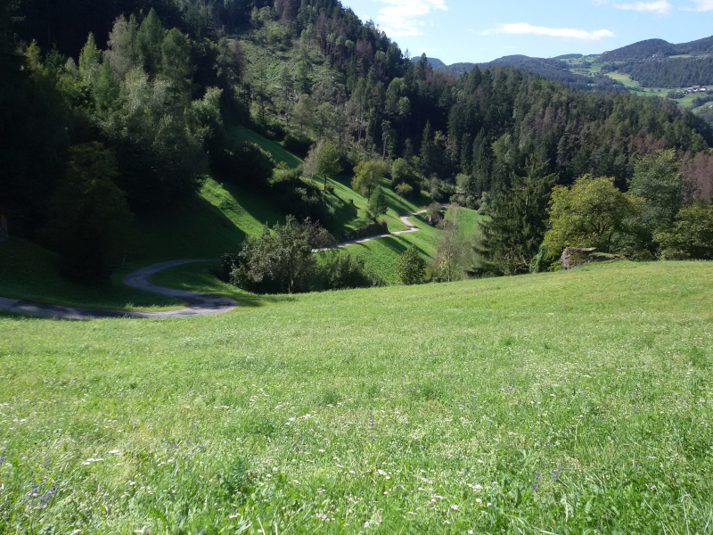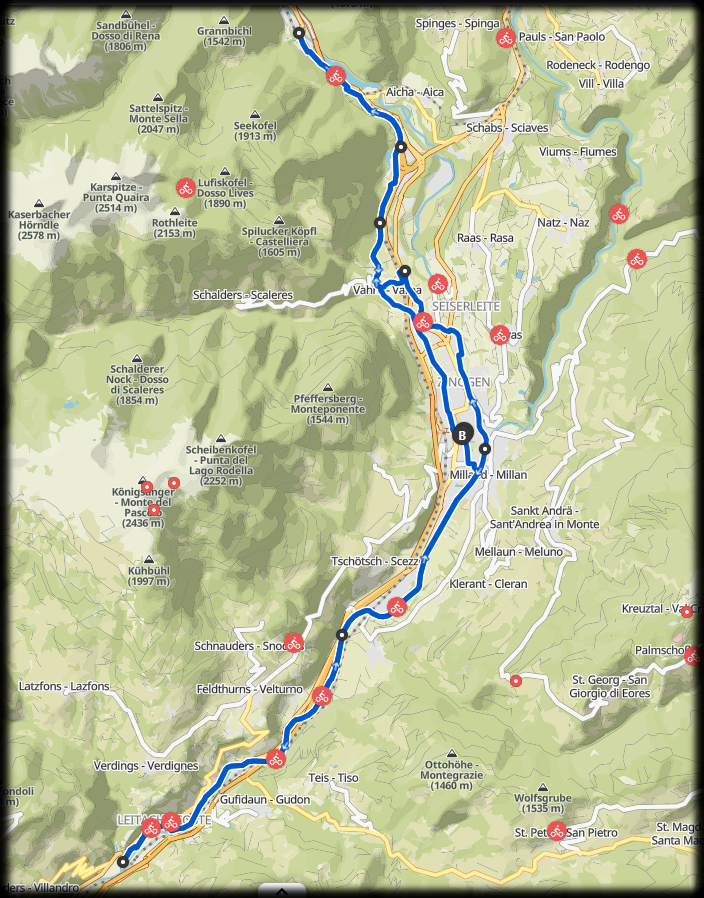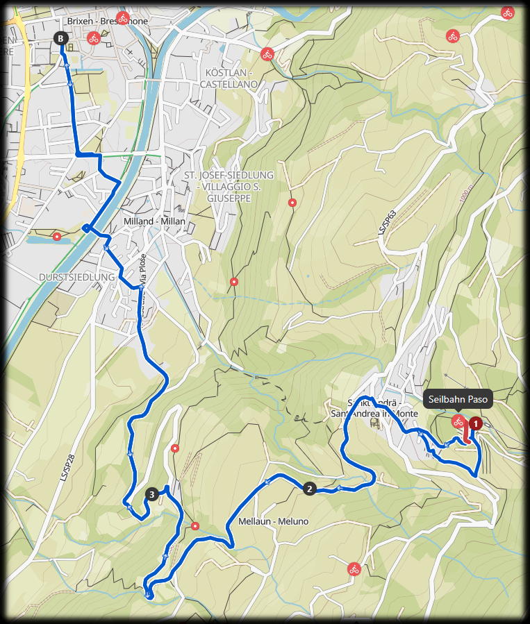 Über eine der zahlreichen Eisackbrücken ging es in den Brixener Vorort Milland, der auf der anderen Seite der Eisack liegt wie Brixen selbst. Ab Milland ging es dann auf der Plosestraße (kein Radweg, nur für Mtb´ler) ca. sechs Kilometer stetig bergauf bis zur Bergbahn. Im Schnitt sind es etwa 12% Steigung. In St. Andräe hat man den letzten Ort vor dem sehr steilen Schlussanstieg ( 19% ) zur Bergbahn selbst erreicht.