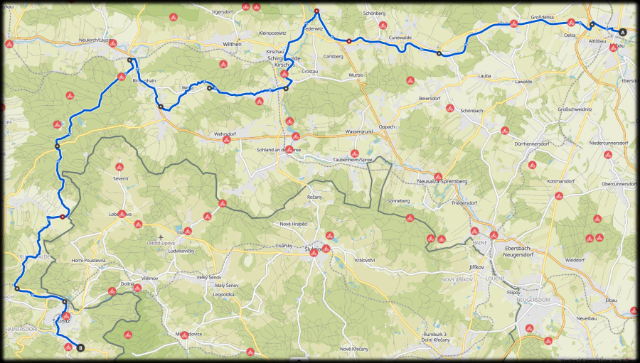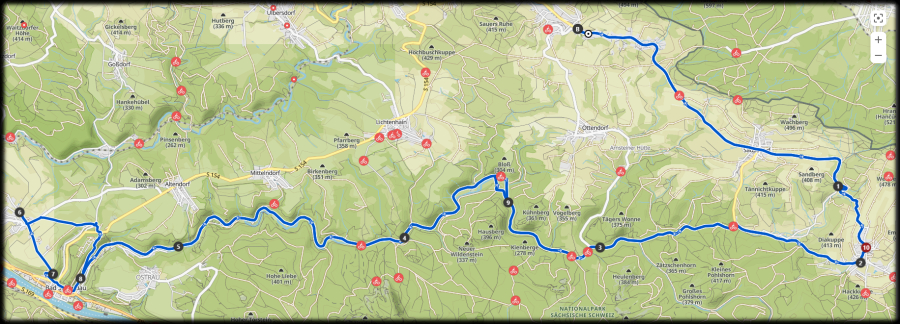 Ziel meiner heutigen Etappe war Bad Schandau. Über Saupsdorf ging es weiter nach Hinterhermsdorf. Bis Hinterhermsdorf das gleiche Bild wie gestern. Über den Berg, Abfahrt in den nächsten Ort und wieder hoch. Zwar kamen heute keine 1000 HM wie am Tag zuvor zusammen, aber auch heute waren es wieder über 800.