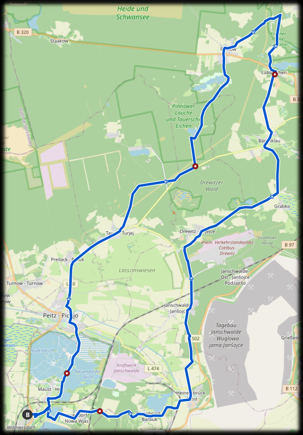 26.05.2023: Hotel - Peitzer Teiche - Heinersbrück - Lübbinchen - Peitz - Hotel