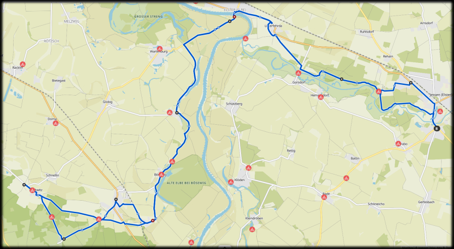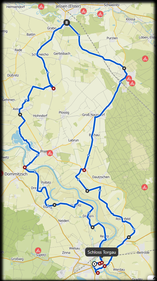 Bei meiner gestrigen Tour nach Bad Schmiedeberg und anschließend über Dommitzsch nach Prettin bin ich schon viel auf der Straße gefahren, weil es keinen eigenen Radweg gibt. Auch bei der heutigen Tour ging es viel auf Kreis- und Landstraßen, der Schwarze Elsterradweg ist Teil derselben. Auch die Beschilderung auf den Straßen ist stark verbesserungswürdig. Wer kein Fahrrad-Navi hat oder sich mit Hilfe des Handys navigieren lässt, dem sei eine Fahrrad-Karte zu empfehlen. Sonst landet man wo man als Radfahrer auf keinen Fall hin will. (Auf der Bundesstraße)