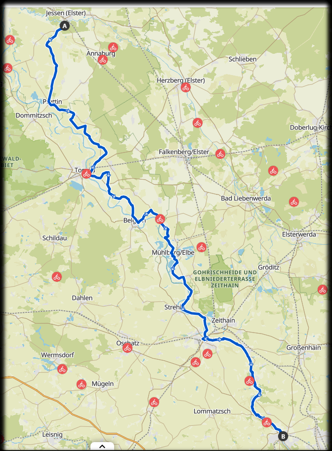 510 Kilometer in sechs Etappen bei den Temperaturen waren schon anstrengend. Der Schwarze-Elsterradweg verläuft zwischen Elster und Klossa auf einem sehr schönen Radweg durch den Wald, danach fährt man meist auf Straßen. Es gibt in dieser Region nicht genug reine Radwege, kein Vergleich mit dem Spreewald.