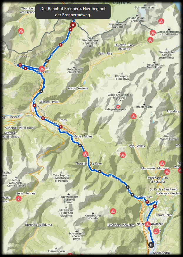 Da mir die gesamte Strecke zurück mit dem geliehenen Rad zu weit war, ging es zum Bozener Hauptbahnhof. Von dort mit dem Zug bis Waidbruck, der Rest mit dem Rad zurück nach Brixen.