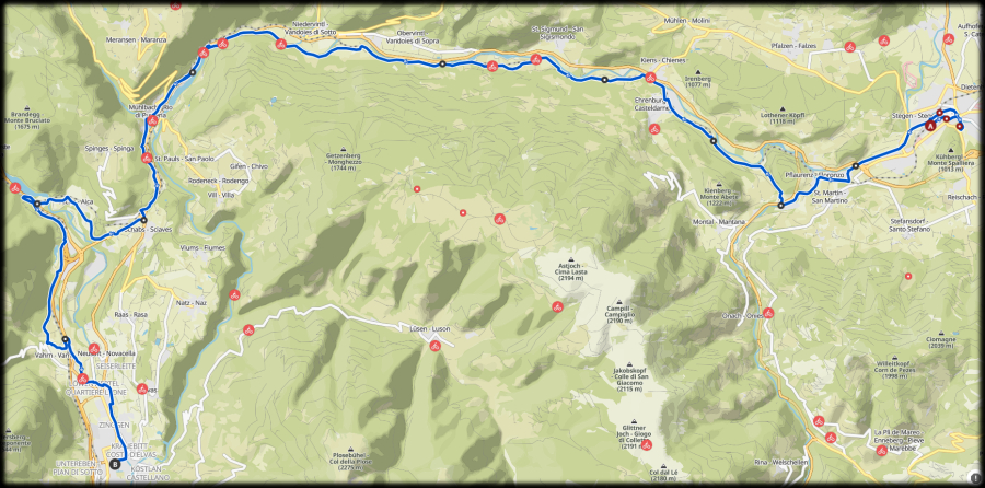 Von Brixen bis zur Brücke sind es etwa fünfundzwanzig Kilometer. Vielleicht hätte ich die Anfahrt bis Waidbruck mit dem Zug machen sollen. Laut meinem Navi betrug das steilste Stück 19 %.